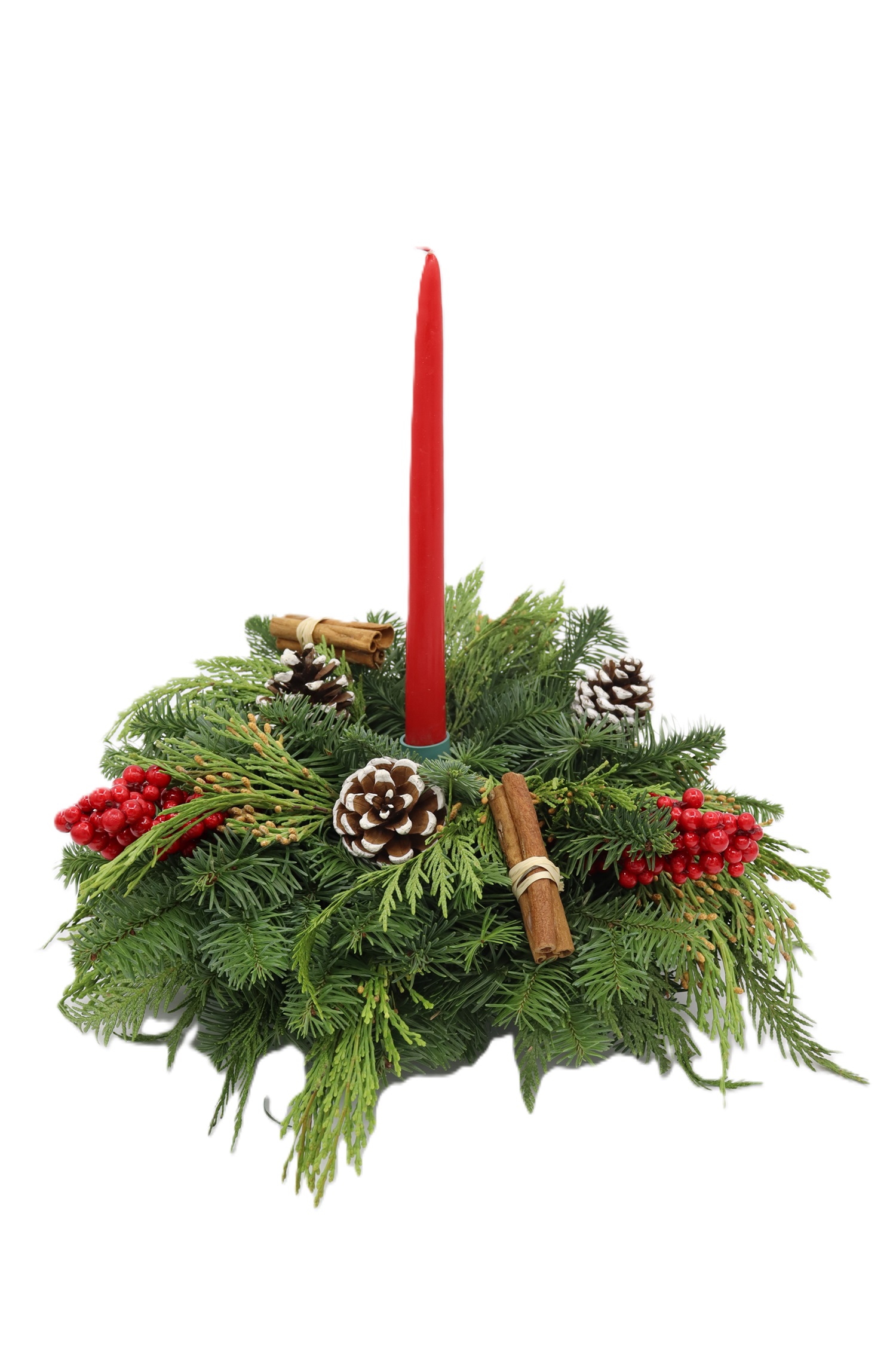 Noble Fir, Incense cedar and white lodgepole cones with red berries and cinnamon sticks.